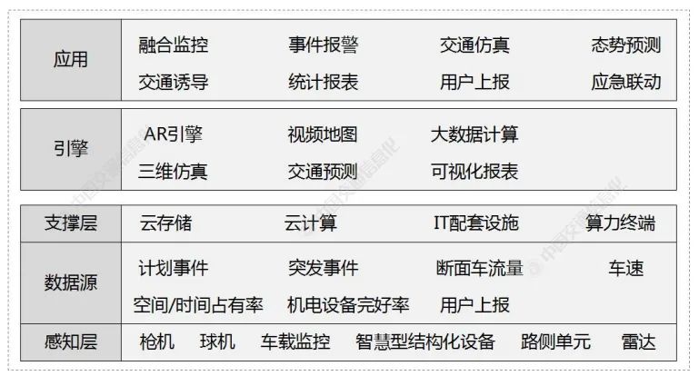 基于上述算法,提出了高速公路區(qū)間交通態(tài)勢預測系統(tǒng)架構,分為感知層、數(shù)據源層、支撐層、引擎層和應用層。每個層次根據不同的功能又分為不同的應用模塊。系統(tǒng)架構如下圖所示。各層分別執(zhí)行以下功能。