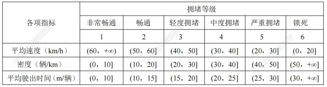 美國交通研究委員會發(fā)行的《道路通信能力手冊》[15]中將交通擁堵狀態(tài)分為六個等級:1非常暢通、2暢通、3輕度擁堵、4中度擁堵、5嚴重擁堵、6鎖死,數(shù)值越高表明交通擁堵情況越嚴重。結合本文具有的道路數(shù)據資源,確定3個因素指標對應交通擁堵狀態(tài)的取值范圍,如表2所示。